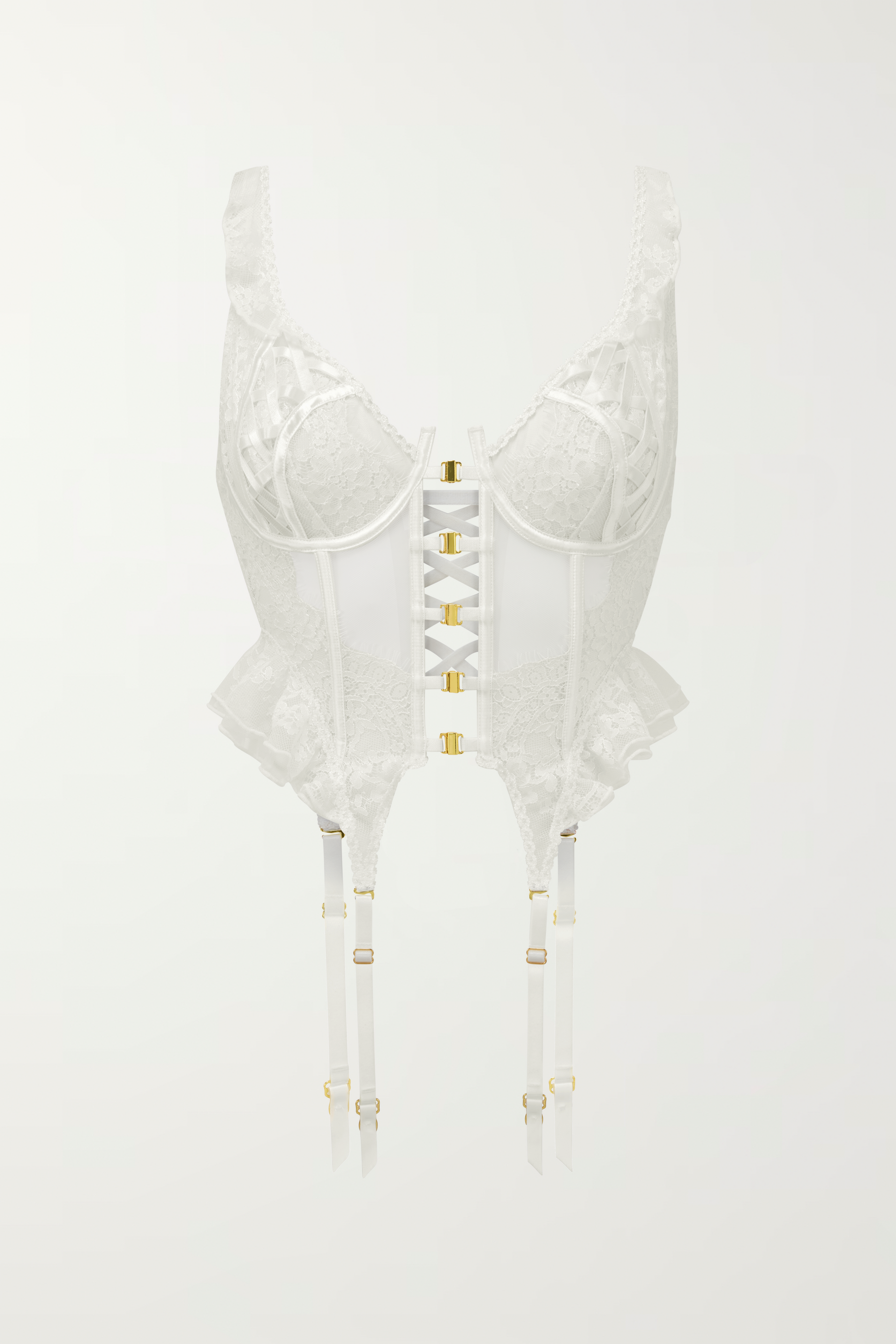 This bridal-inspired corset blends soft white lace with sculpting mesh and gold hardware. The structured bodice features underwired cups, satin covered boning, and fluted edges that frame your waist like a love letter.